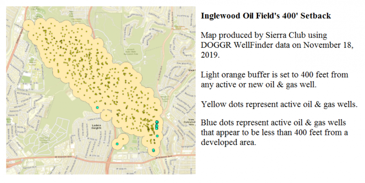 Currently, the regulations allow oil operations to take place just 400 feet from homes and schools, putting families in the predominantly African American community of Baldwin Hills at risk of future spill incidents as well as ongoing air pollution and negative health effects. According to Sierra Club analysis, there are 16 active wells that are even less than 400 feet from homes currently operating at the Inglewood Oil Field.