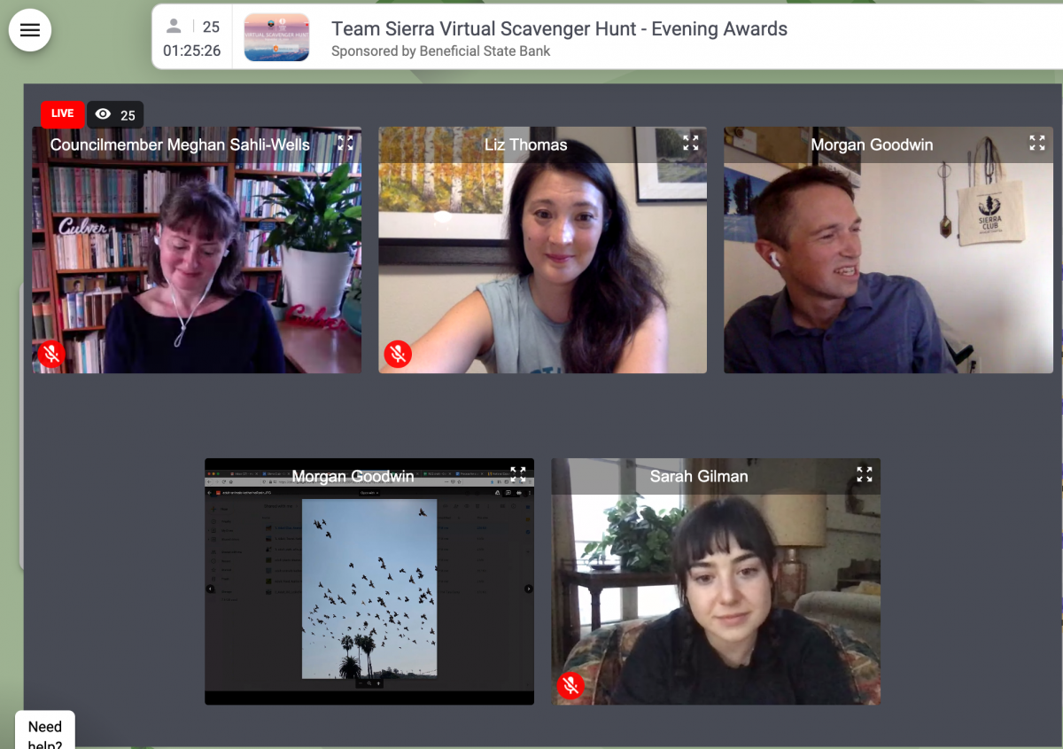 The event kicked off early Saturday morning with coffee and tea on the Remo conferencing platform. Sierra Club members and supporters were introduced to our celebrity leader judges and received instructions for the clues and prizes. The celebrity panel featured actress and activist Sarah Gilman, ‘Thru-hiking legend’ Liz Thomas, and Culver City Councilmember and former Mayor Meghan Sahli-Wells.