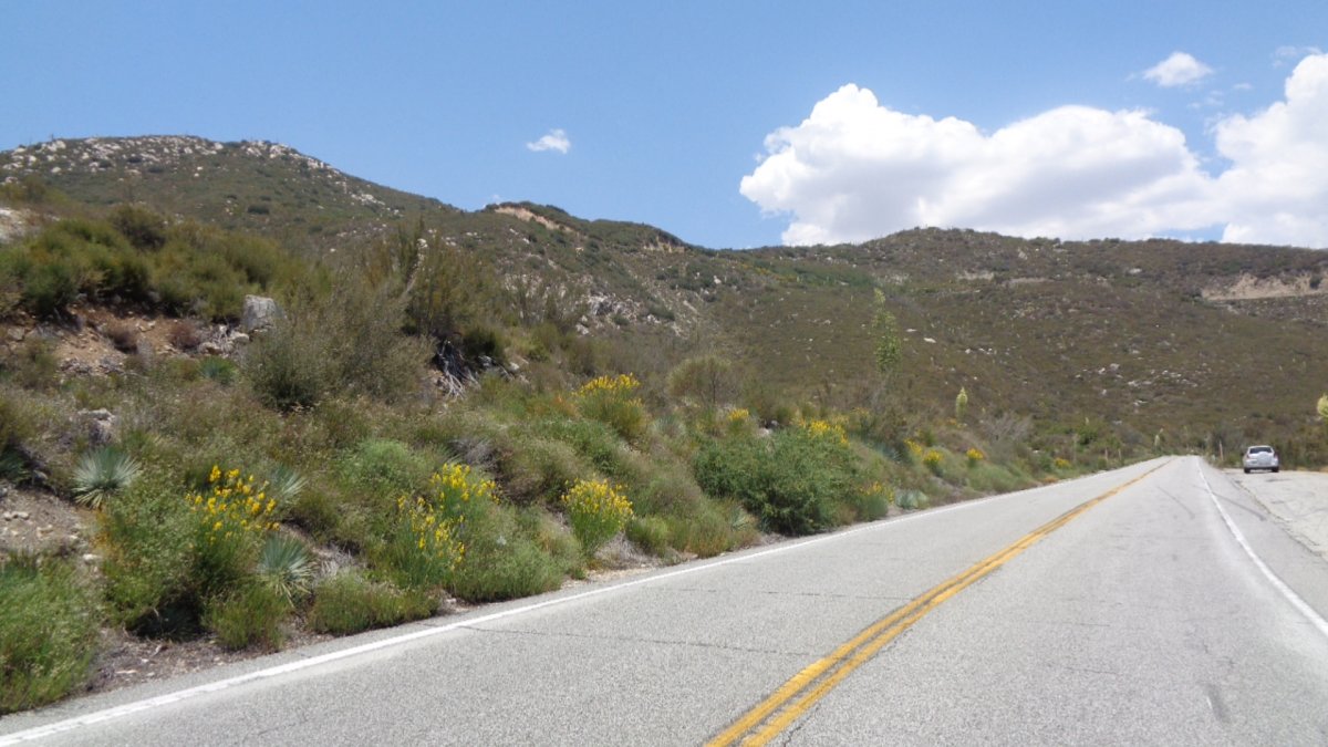 On an earlier trip to Crystal Lake Campground in 2019, I noticed a concentration of about 50 Spanish broom plants next to Highway 39 near the 5000-foot elevation sign, which were not present further up the road. I intended to control these plants starting a year ago but could not because a wildfire near Azusa closed the Highway 39 temporarily and then the large Bobcat fire closed the forest for several months. In mid-June I returned and in 30 minutes I sprayed dilute Milestone herbicide on most flowering broom plants shown below, where not intergrown with natives. I was annoyed to see that the broom infestation was larger than I expected, extending uphill along an abandoned service road toward a large patch of flowering broom next to highway road cuts at a higher level in the distance. In early July I volunteered 3.5 hours to spray much of the upper infestation, where Spanish broom was confined to the road berm and had not spilled over to steep slopes below. In this case my strategy is containment, which is achievable, not eradication which would be difficult.