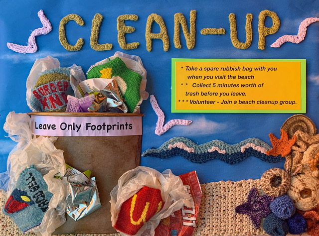 “I belong to a national group called the American Tapestry Alliance. One of our members in Florida launched a call for artists to help her create an exhibit having to do with destruction of coral reefs, and I helped her by crocheting and weaving some fish. From there, I started to think about ways to do something similar for Southern California. I thought it would be a great, accessible way to reach people about the issue of climate change and show them some simple ways to take care of our environment.”