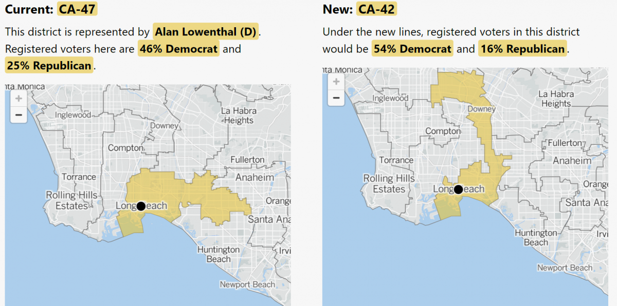 Lucille Roybal-Allard’s district in east and southeast Los Angeles was eliminated. Her district was amalgamated with Alan Lowenthal’s district, another longtime environmental champion from Long Beach. Both of them opted to retire. March 11 is the filing deadline for June 5 primary. We are expecting Assemblymember Christina Garcia, Long Beach Mayor Robert Garcia and Pastor William Moses Summerville to be among the candidates in the new 42nd congressional district that runs north from Long Beach north to Huntington Park. As you would expect from the registration numbers, all are Democrats.