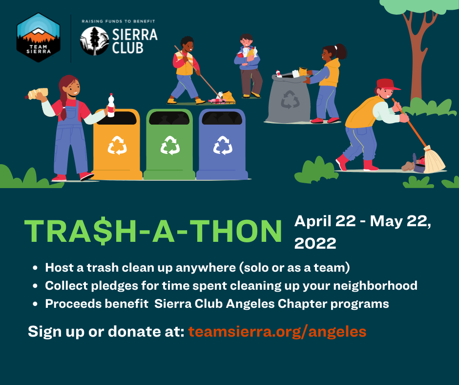 Team Sierra is a community determined to create a healthy world for all. Together, we're raising funds to support the Sierra Club's work for our climate and communities, wildlife and wild places. Earth Day has special meaning for all Sierra Club members. This year the Angeles Chapter will celebrate for an entire month by inviting our members to participate in Trash-a-Thon 2022. Commencing on Earth Day 2022, the event will continue for four weeks.