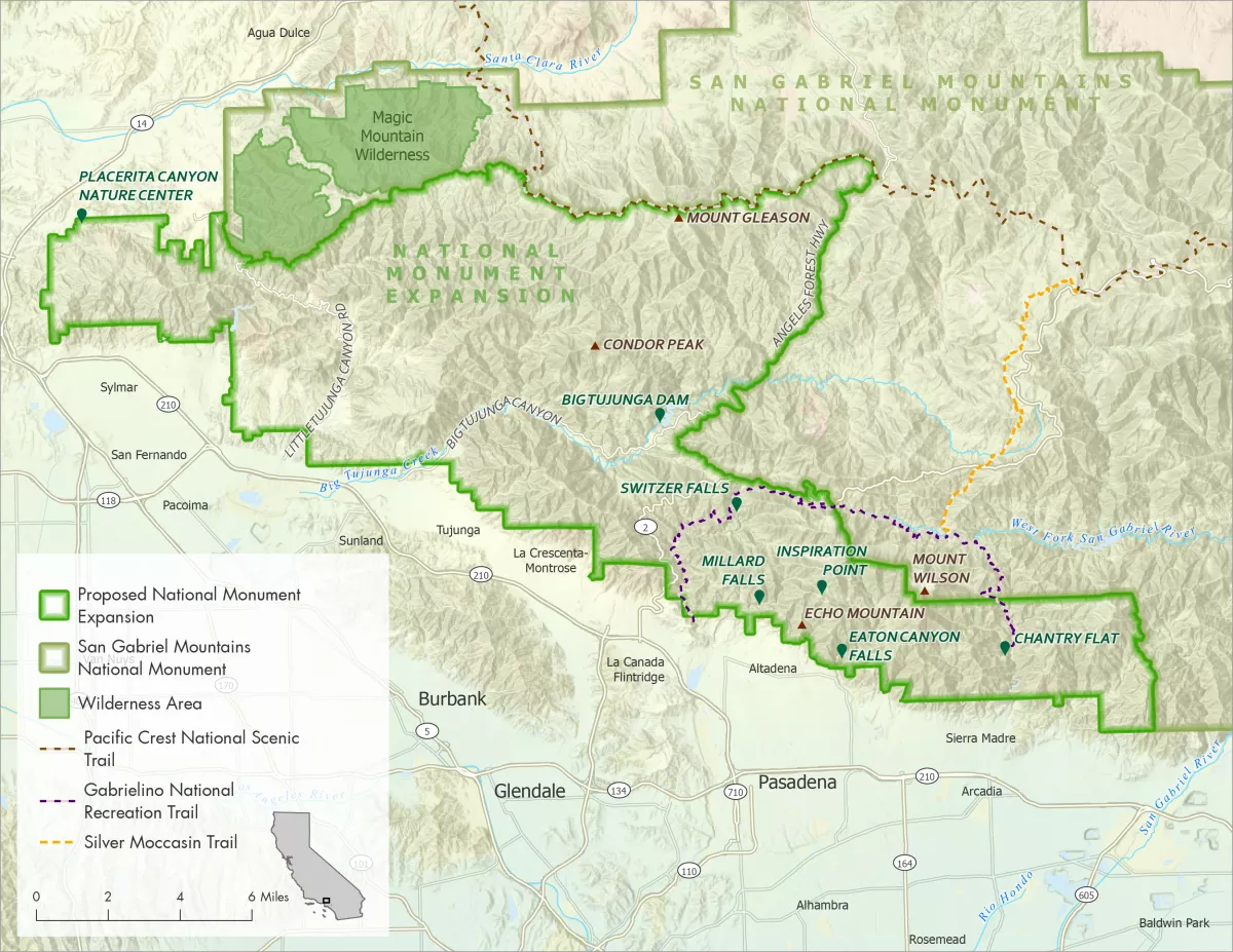 The proposed addition to the San Gabriel Mountains National Monument will cover forest areas east and south of Santa Clarita as well as national forest north of foothill communities from Sylmar east to all the way to Azusa. When the expansion is completed all of the San Gabriel Mountains in Los Angeles County will be in the monument, adding well-known forest landmarks like Chantry Flats, Echo Mountain, Switzer Falls, and the Gabrielino Trail.