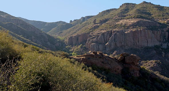 | 2014 January 25, Saturday. O: Devils Canyon. Dora Olea, Susan Campo. On the corner of San Fernando Valley, Devils Canyon sports abundant growths of live oaks and willow and a small, intermittent stream. We will admire the wind-and-water-carved sandstone bedrock along both sides of the canyon. This sandstone, a part of the same formation exposed at Stony Point and Santa Susana Pass, originated from marine sediments laid down roughly 80 million years ago. Shallow caves can be found in Devils Canyon's tributaries-especially Falls Creek- if you don't mind a little bushwhacking. Moderate hike. Dogs welcome. Bring water, lug soles, sunscreen, and your lunch. Meet 9 am. For driving directions and more details about the trip, please email the leader Dora at chamaca1954@att.net. |