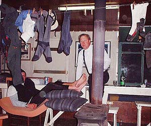 The Big Thaw Arriving at the hut after blazing a long skin track in virgin pow. Jay and Chris enjoy the heat of the moment. Notice the socks, and feet, en route to the thaw zone.