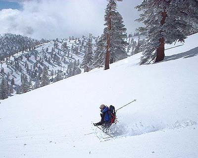 Headin Home Gilski heads for the Hut, but not before laying his line in some outstanding snow. Location: Just below the summit of Mt. San Antonio. Some reeeaaallll gooood skiiiinng!