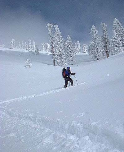 White Beauty Well, to our good fortune, the weather man called it right. We awoke to 2' of fresh the next morning, and still snowing. Pictured is Gil Estrada, breakin trail in some of the lightest stuff ever seen. Location: near plane wreck on West Ridge.