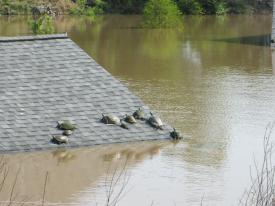 May 27 - After more flooding in Texas and Oklahoma, water level is again at the ceiling of the shelters along the (now submerged) boardwalk (left photo above). (I-30 bridge in the background.) ...right photo above shows turtles on roof of shelter around 10:30 am June 4, shortly after water level had crested.