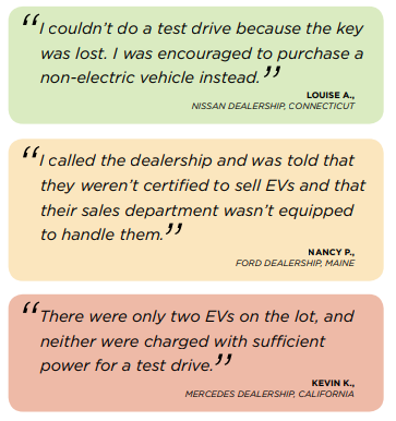 The results from that multistate study helped expose that the auto industry was barely lifting a finger to provide dealerships with EV inventory, train salespeople about EVs, or market EVs effectively. In addition to finding that there were often no EVs on dealer lots, we found that only about half of salespeople explained how to fuel a plug-in vehicle, and just a third discussed available rebates and tax credits to lower the cost of EVs. Many EVs weren’t even charged and ready for a test drive!