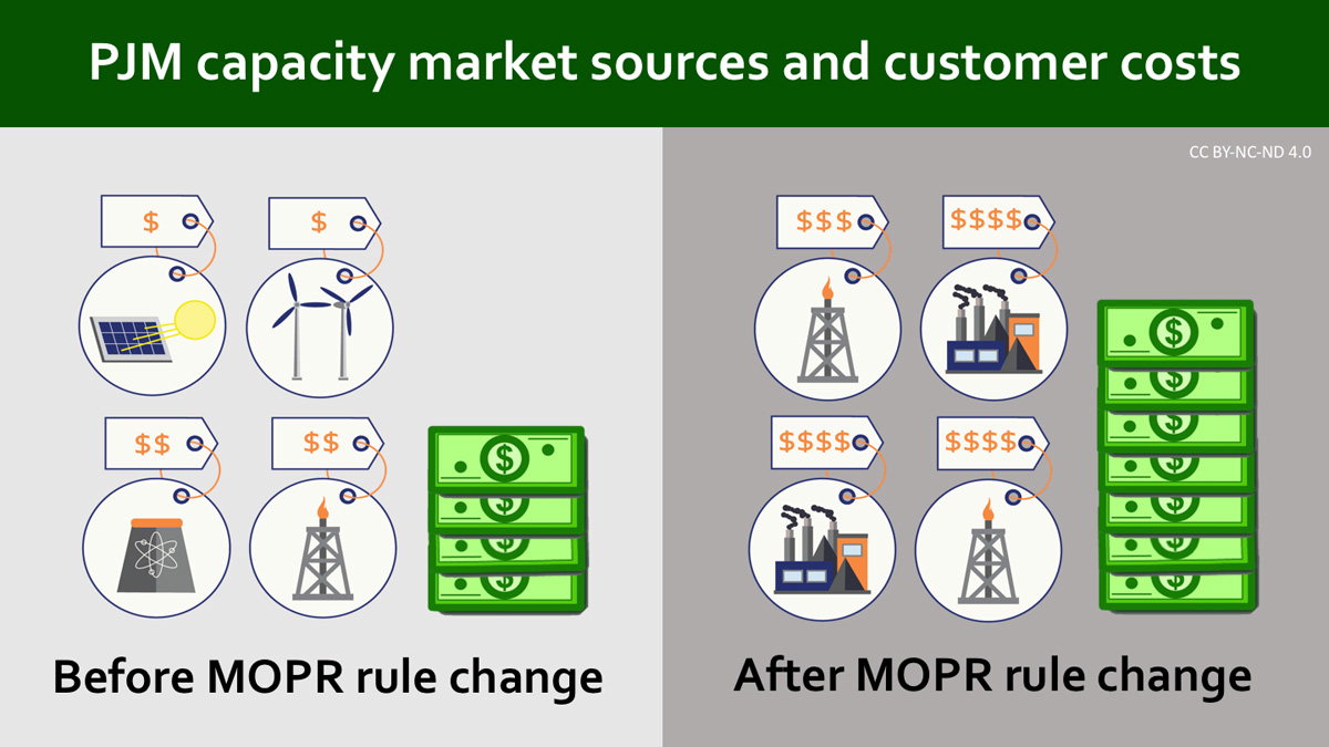 Despite the majority of its stakeholders voting in favor of keeping current market rules in place, PJM went ahead and asked FERC to impose a kind of price penalty--what’s called a minimum offer price rule (MOPR)--on the capacity market bid of any resource that receives a state incentive. When subject to the MOPR, a resource can no longer offer at its actual price, but is instead forced to offer at an artificially high price that PJM deems correct. A resource bidding at this price will almost always be too expensive to clear the market. In effect, the MOPR rule would allow more expensive fossil fuel bids to appear to be lowest cost--giving them an advantage in the market.
