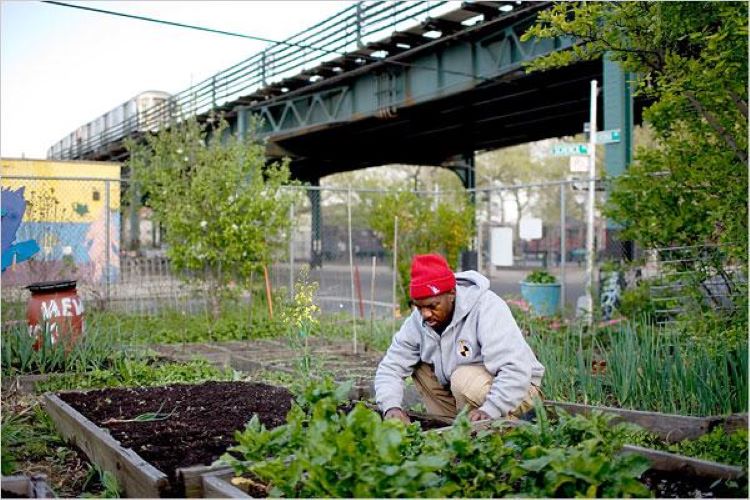 A volunteer at an urban farm in Detroit. Photo by Rochester Talon student newspaper.