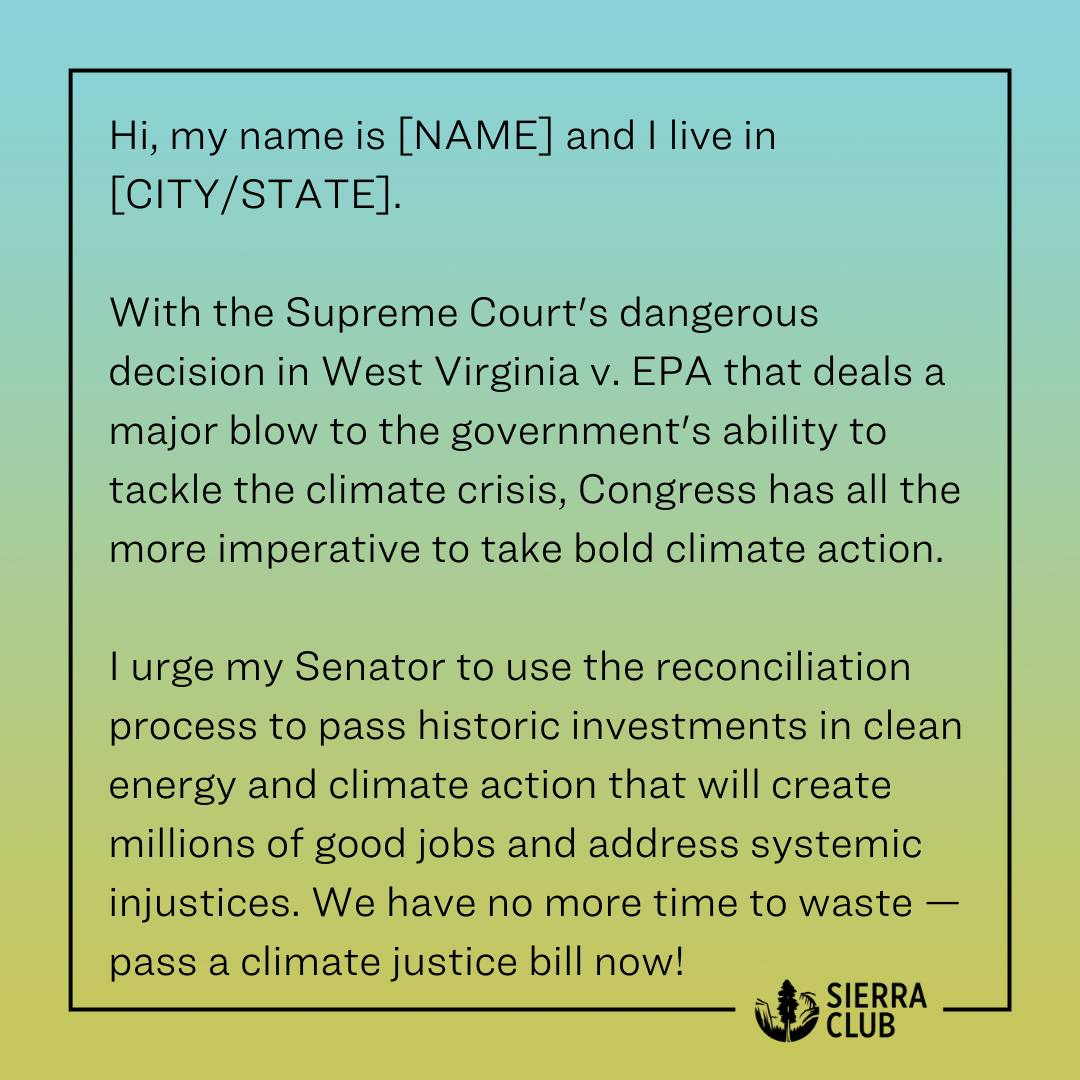 Script for your call: Hi, my name is [NAME] and I live in [CITY/STATE]. With the Supreme Court's dangerous decision in West Virginia v. EPA that deals a major blow to the government's ability to tackle the climate crisis, Congress has all the more imperative to take bold climate action. I urge my Senator to use the reconciliation process to pass historic investments in clean energy and climate action that will create millions of good jobs and address systemic injustices. We have no more time to waste -- pass a climate justice bill now! Thank you.