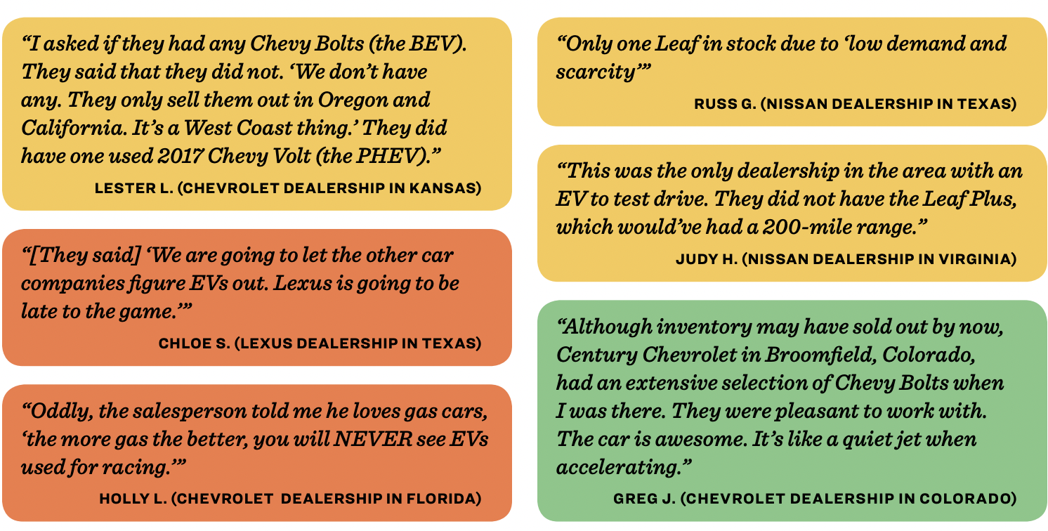 Our volunteers also reported positive experiences when surveying dealerships. After taking an EV for a test drive and hearing more information from the salesperson, some volunteers ended up purchasing an EV at a dealership or Tesla store. In the 2019 report, we highlighted over 90 dealerships and stores across the country where volunteers had great experiences shopping for an EV.