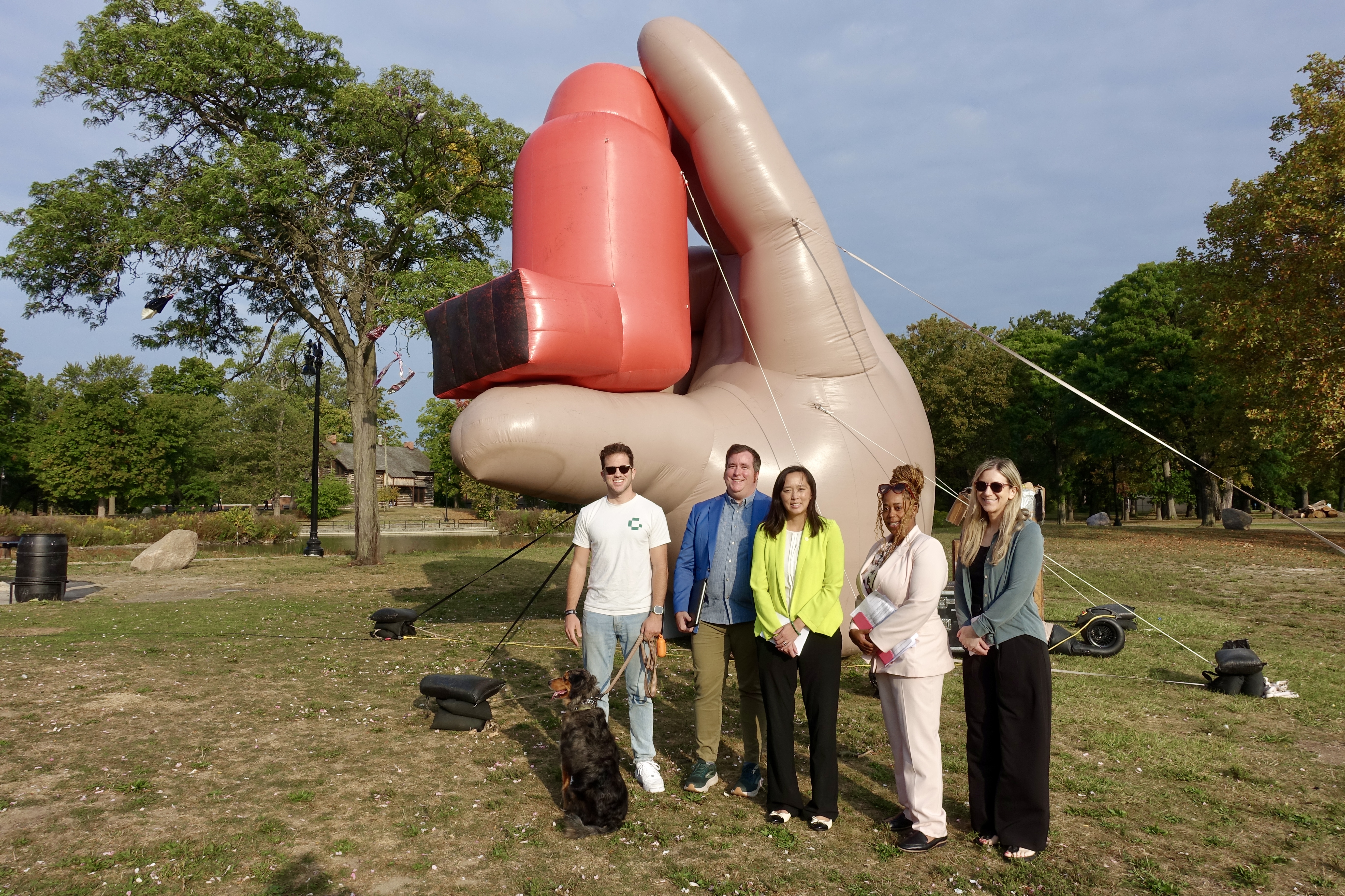 From left to right: Sam Shapiro, Founder and CEO of Grounded RVs and Finn the Dog, part of the imaginary Detroit Dogs Care Alliance; Dr. Latressa Gordon, ANHE and Director of Programs at Michigan United; State Sen. Stephanie Chang, Senate District 03; Alan Hejl, Founder and lead Accessibility Consultant at Spark Access; Sarah Hoogterp, Project Manager at Southwest Detroit Environmental Vision
