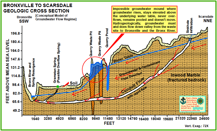 <--- Click here for Bronxville to Scarsdale Geologic Cross Section, indicates groundwater interaction with Toxic Quarry Waste Pits. The groundwater runs South - South/West from Scarsdale, through Eastchester, through Tuckahoe, through the Toxic Quarry Waste Pits, and continues through Bronxville and the Bronx River. The groundwater found on the Toxic Quarry Dump site is highly contaminated.