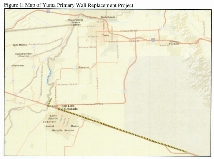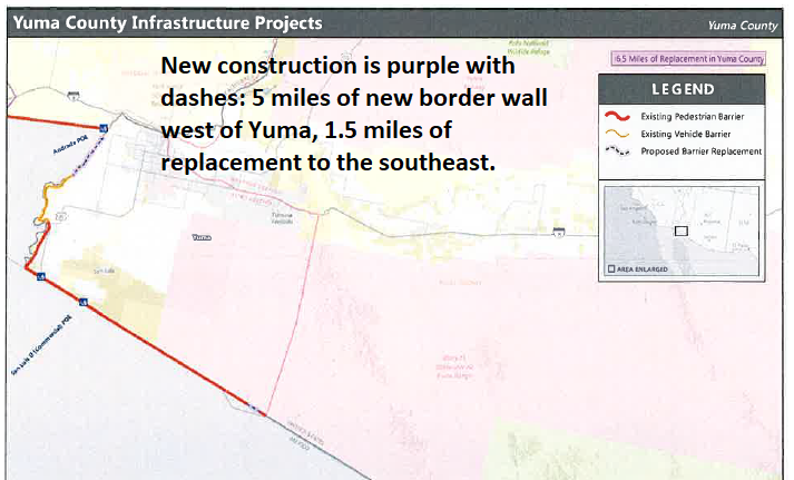 FR Doc. 2019-08291: Corresponds to “Yuma County Infrastructure Projects," 6.5 miles of new (5 miles in NW Yuma) and replacement (1.5 miles on Barry M. Goldwater Range) bollard wall in two sections near Yuma, AZ – 32 laws waived, exact same laws as “Yuma Primary Fence Replacement” below. Note that this includes portions of both the "Yuma 1" and "Yuma 2" projects outlined in the leaked document from DHS regarding Defense funds used for Trump walls. Contracts for both the "Yuma 1" and "Yuma 2" projects appear to have been awarded to Barnard Construction of Montana on or before April 10, 2019, before the public comment deadline of May 8, 2019. The contract amount is $187 million for 11 new and replacement miles of 18 to 30-foot border walls, an average cost to the U.S. taxpayer of $17 million per mile.