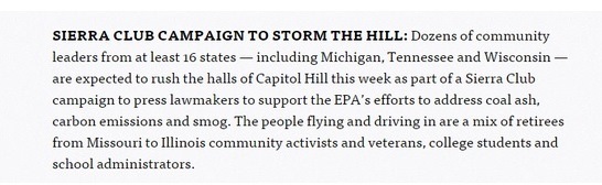 "Sierra Club Campaign to Storm the Hill." That was the Monday morning headline in Politico's popular daily energy newsletter, "Morning Energy," which reaches over 14,000 Washington movers and shakers.