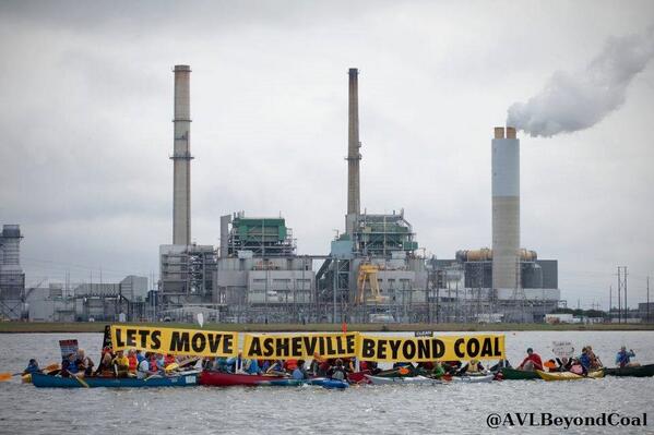 October 2012: More than 100 citizens and Asheville Beyond Coal activists formed a flotilla on Lake Julian -- in front of Asheville's coal-fired power plant -- to raise three 17-foot banners to deliver the message loud and clear, "Let's Move Asheville Beyond Coal." That photo is at the top of this blog post.