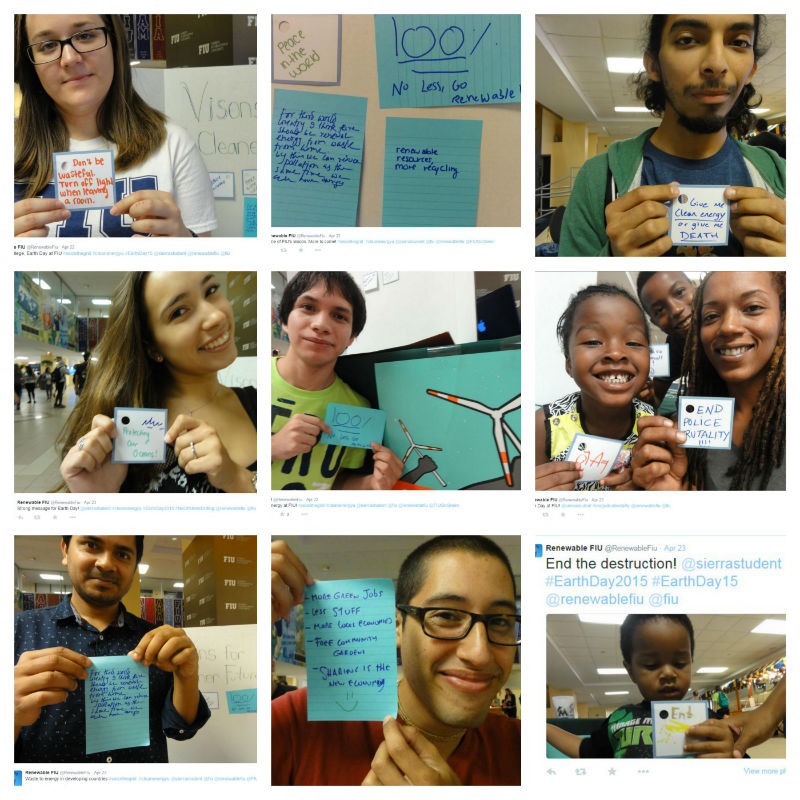 On Earth Day 2015, G.L.A.D.E.S., an environmental club at Florida International University, held a photo petition, collecting visions for a better future. We asked people to write their vision on a post-it and took pictures. We emphasized visions for a transition to renewable energy, but allowed people to write anything they wanted.