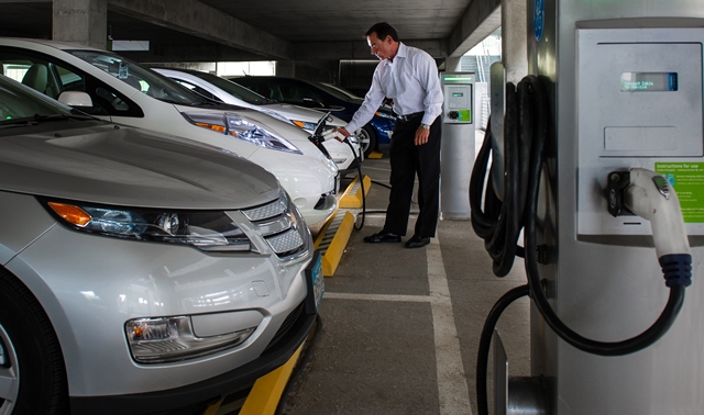 Photo Above: NREL employee Kevin Donovan plugs his electric vehicle into one of the 36 charging stations in the NREL parking garage.