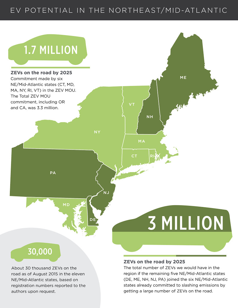 The infographic below shows while there are currently only about 30,000 plug-in cars on the road in the 11-state regions focused on in the report, six of the states have collectively committed to get 1.7 million on the road in 10 years, and if we added the states in the regions that haven’t committed to EV adoption (but should), that brings us to 3 million EVs on the road in the northeast and mid-Atlantic by 2025. The difference between 30,000 current EVs and 3 million needed EVs in 10 years is vast, but we’ve made an important start -- reaching this goal will take aggressive action, but not rocket science.