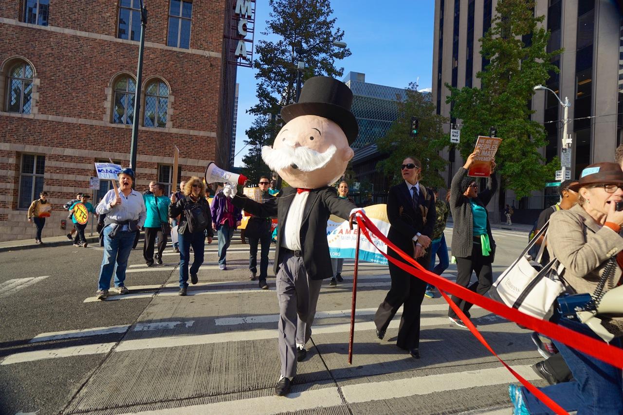 Prior to the march, the Sierra Club, Seattle 350, Washington Fair Trade Coalition, and several unions put on street theater against the Trans-Pacific Partnership with Monopoly characters at a mock press conference (below).