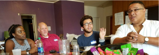 Image: Participants in a Detroit movement-building workshop in July discuss intersections between NAFTA and local fights. From left to right: LaVita Tuff of BlueGreen Alliance, Mike Schulte of Communications Workers of America, Anthony Torres of the Sierra Club’s trade team, and Sierra Club volunteer Vincent Martin.
