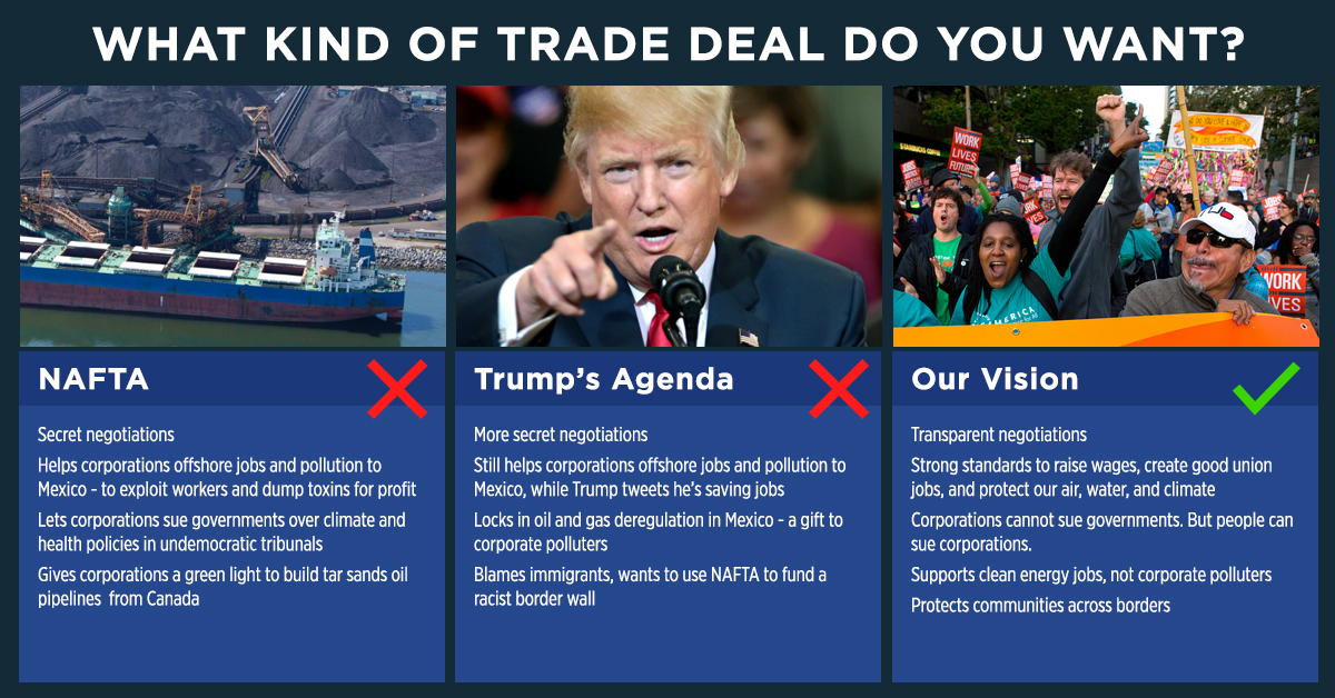 We must replace NAFTA with a deal that prioritizes people over polluters -- centering on those hit hardest by the fossil fuel economy: working families, immigrants, women, people of color, Indigenous groups, and climate-impacted communities. What would a North American trade deal look like if it prioritized the needs and aspirations of our communities, not the profit margins of CEOs?