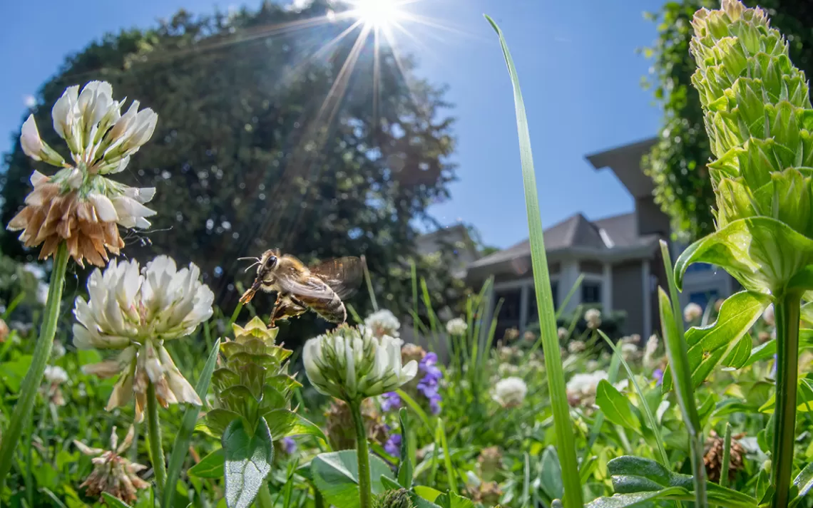 Los beneficios de los jardines de abejas van mucho más allá de los polinizadores. Los céspedes tradicionales requieren una gran cantidad de "insumos", como fertilizantes, siega, pesticidas y agua, a diferencia de la fina hierba de festuca que se usa en la mezcla de semillas para césped de abejas. “La festuca fina tiene una sexta parte de las necesidades de fertilizantes de un césped tradicional”, dice Wolfin. “Puedes pasar cuatro semanas sin regarlo y puedes cortarlo solo tres veces al año”.