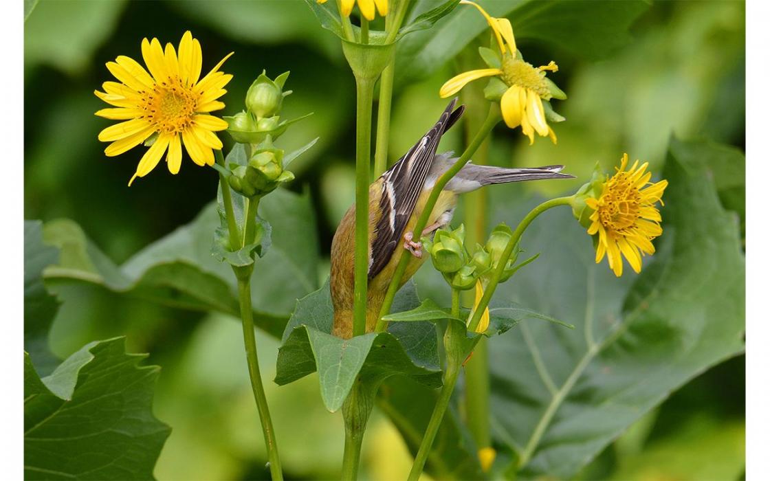 Travis Bonovsky de Brooklyn Center, Minnesota, ganó el premio Plants for Birds, creado en 2019 para resaltar el papel esencial de las plantas nativas, el hábitat y las fuentes de alimento que brindan a las aves. Este jilguero americano posa en una planta de copa en Minneapolis.