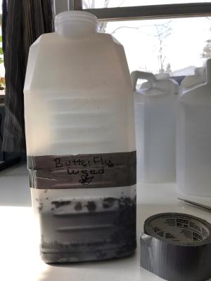 Milkweed seeds require cold stratification before planting, most types for at least 60 days. There are many ways to accomplish this but we are going to try what is trending right now, recycling plastic milk jugs/containers. Seeing as milk jugs were something we did not have on hand, using cat litter plastic containers was the next choice for our experiment. You want to use a clear or opaque plastic. If you use an opaque one like we did, you need to put in some extra drainage holes in the bottom. Toss the lids in the recycling bin, you won't need them as you want water to enter the container when it rains. Here is what you do:
