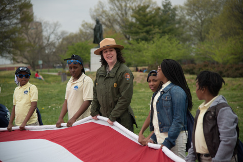 After getting their Every Kid in a Park passes, the fourth graders learned about the Monument and participated in a series of nature-based activities. The defense of Fort McHenry was the inspiration for Francis Scott Key to write the Star-Spangled Banner and the kids got to fold a massive replica of the flag with National Park Service rangers.
