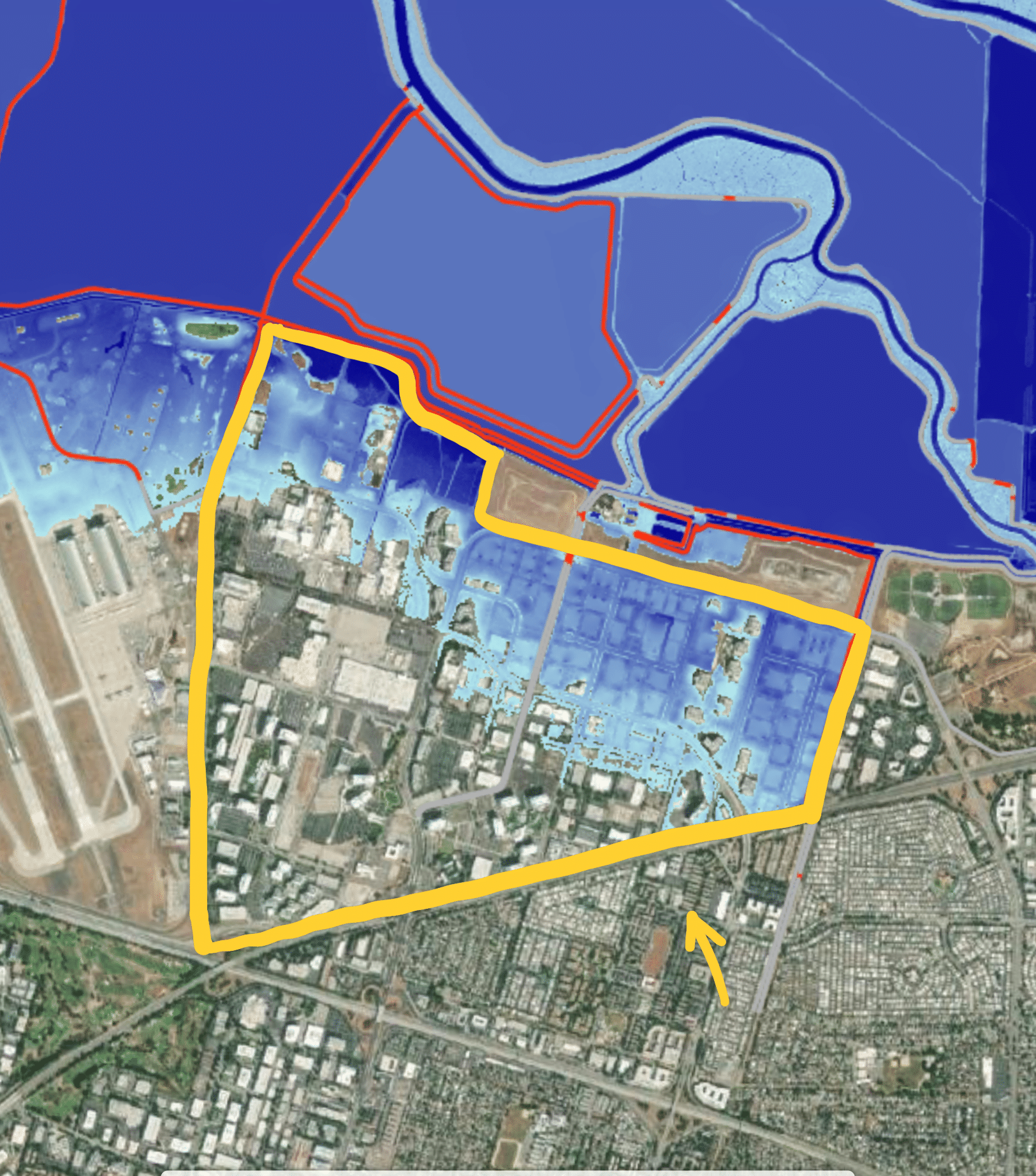Moffett Park Plan area with 2 feet of SLR plus a King tide. Credit: BCDC Adapting to Rising Tides, Bay Shoreline Flood Explorer