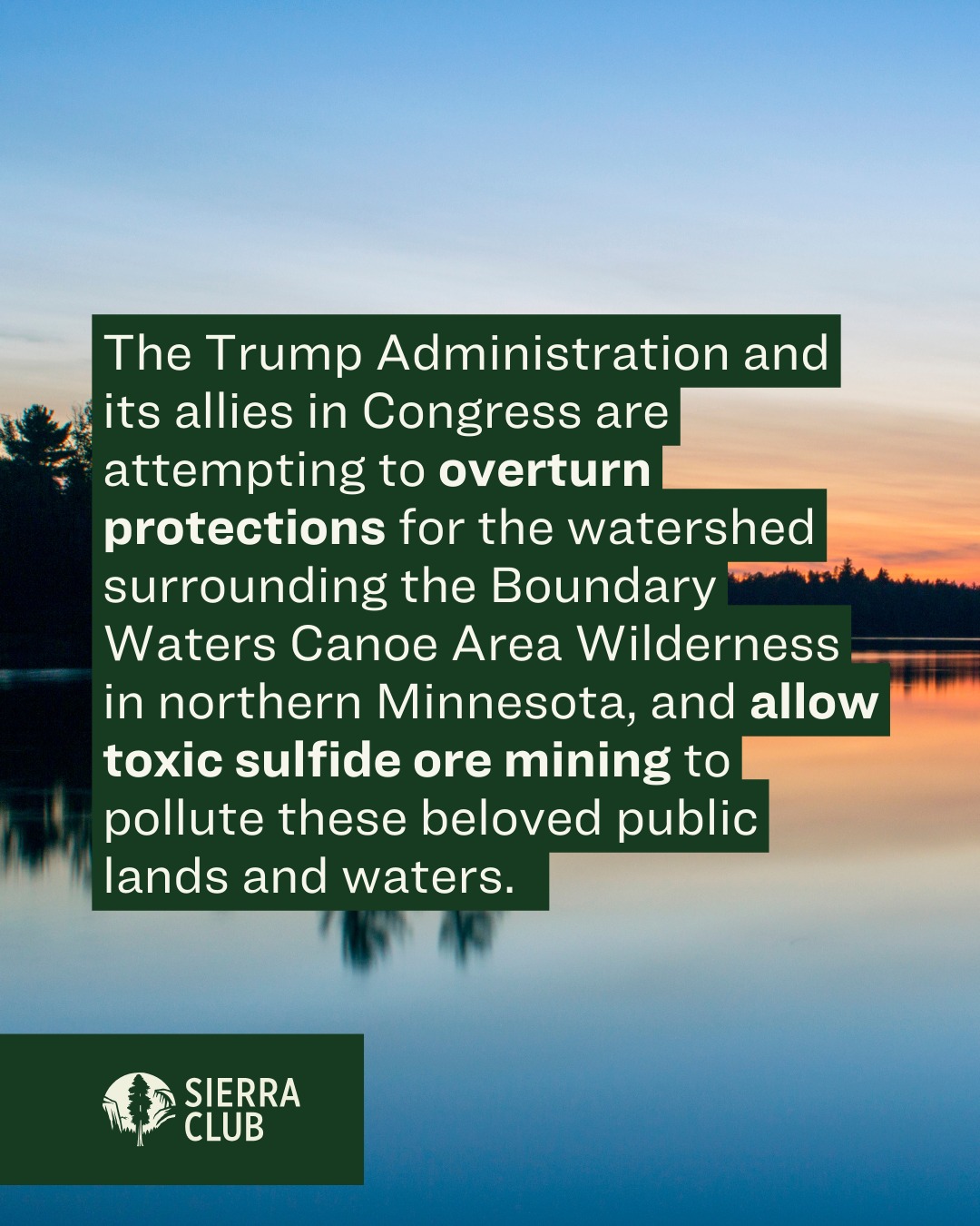 The Boundary Waters Canoe Area Wilderness in northern Minnesota is one of our nation’s most popular wilderness areas. In 2023 after years of organizing, the Interior Department finalized a 20-year mining ban for its surrounding watershed to safeguard clean water, wildlife habitat, wilderness values, cultural resources, and recreation opportunities. But now, the Trump Administration and its allies in Congress are attempting to overturn these protections and allow toxic sulfide ore mining to pollute these beloved public lands and waters.