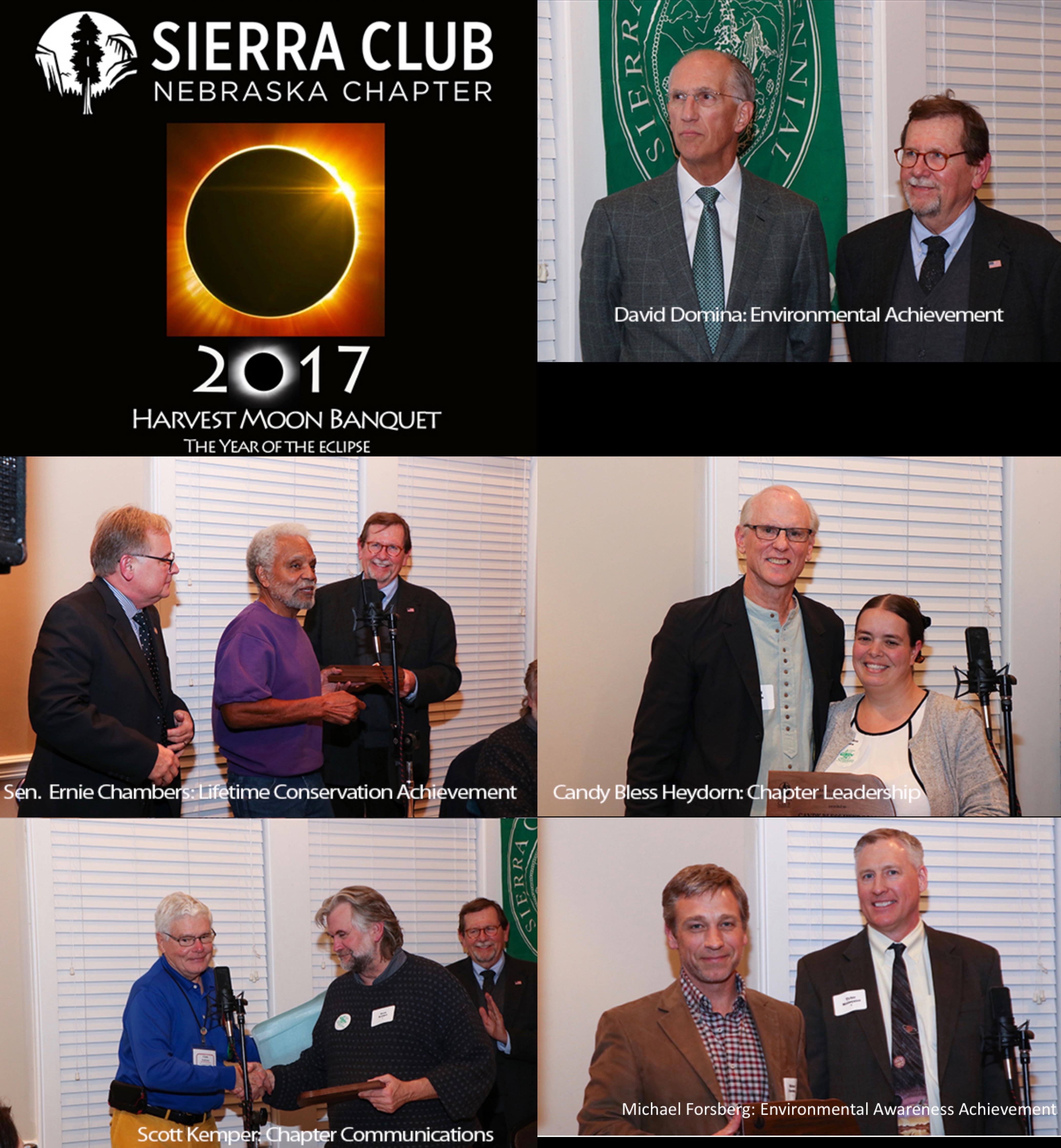 Award winners (presented by NSC chair, Candy Bless) at the Nebraska Sierra Club Harvest Moon Banquet, Oct. 16, 2016: Clockwise from upper left: Senator Ken Haar, Eric Williams (also accepting an award on behalf of his brother Scott Williams), national Sierra Club President Aaron Mair and Bill Moore. Congratulations to all the winners