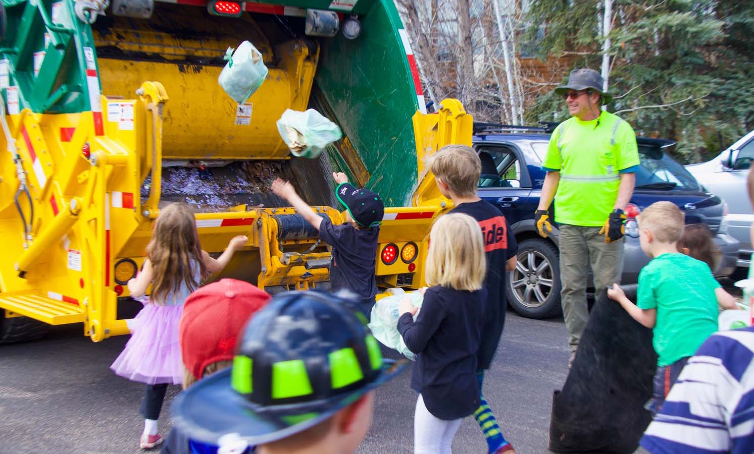 The day of the birthday party, the trash company sent out one of their big trash trucks so the kids could throw their bags into the truck themselves, honk the horn, and pretend to drive the truck.
