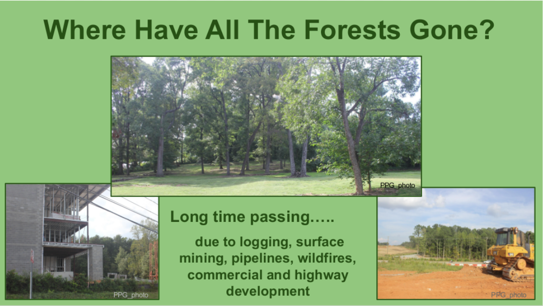 The newly condensed slideshow presentation of “Save Our Trees” focuses on an appeal to the Greensboro City Council to stop rezoning forestland for urban development. It's our intent to highly encourage the city council to take immediate action to Save Our Trees! Click here to view the slideshow: “Save Our Trees”.