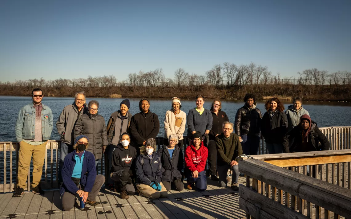 Volunteers gather at the end of a pier to check the flow system.