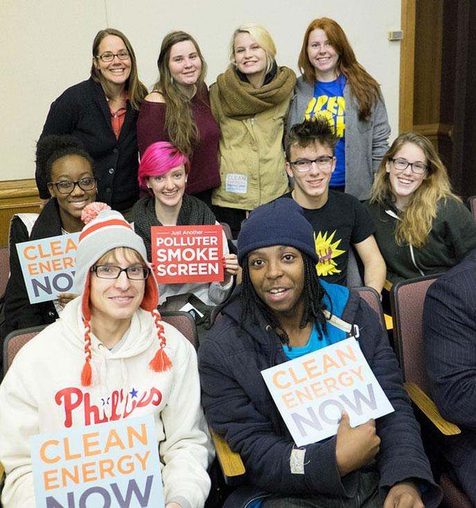 Addelson says that of the 13 people who spoke during the public comment period, 10 spoke in support of the Clean Power Plan, two spoke against, and one was neutral. Below, Sierra Club interns Allison Wishon and Abby Kemp, Virginia Chapter organizer Kendyl Crawford, intern Jamie Pham, chapter conservation director Kate Addleson, and chapter director Glen Besa outside the hearing room.