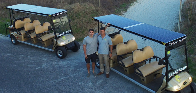 Coda and Cotreau originally wanted to service downtown Charleston, but the city has regulations against golf carts and low-speed vehicles transporting people as a business. "So we shifted our sights to Folly Beach," Cotreau says, "and people immediately loved the concept. Our 'solar carts' are eye-catching, and each month last year we saw an increase in calls, rides given, and revenue. We hope to demonstrate to Charleston and other markets that it's viable and really works."