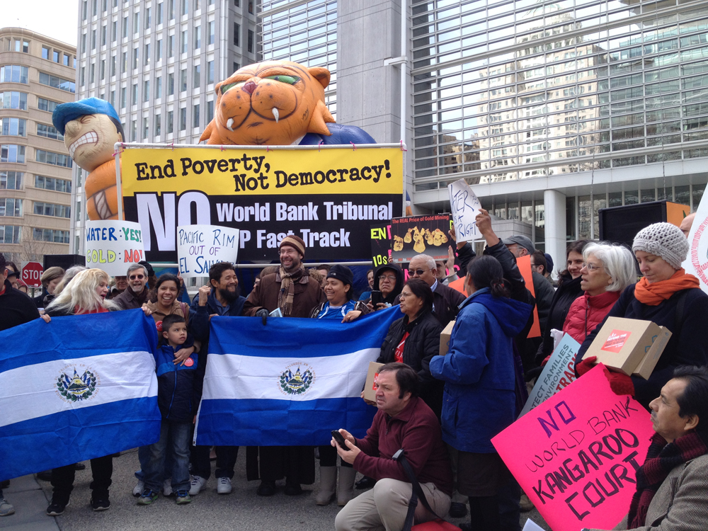 The purpose of the event was to call for the case to be dropped, as well as to draw attention to the dangers of investor-state dispute settlement (ISDS) – also known as “corporate sovereignty” – provisions in trade deals such as this one. These provisions would allow multinational corporations to use international tribunals, such as the World Bank’s International Centre for the Settlement of Investment Disputes (ICSID) where the protest was held, to challenge government laws that they claim threaten their expected profits. For instance, in this case, the Pacific Rim Mining Company and OceanaGold would be able to completely ignore the Salvadoran government’s refusal to grant the permit and their concerns about the mine, just because the end result could mean a loss of profit.
