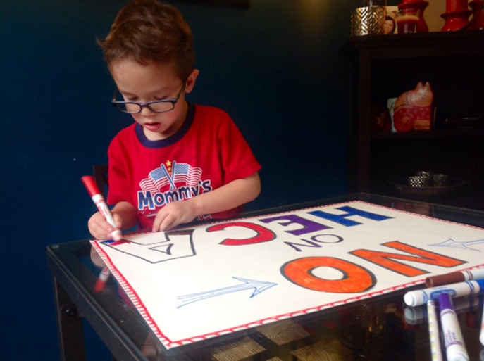 Above, that's Nikolas Leon making a homemade "No on HECA" sign. Below, Nikolas displays his handiwork.