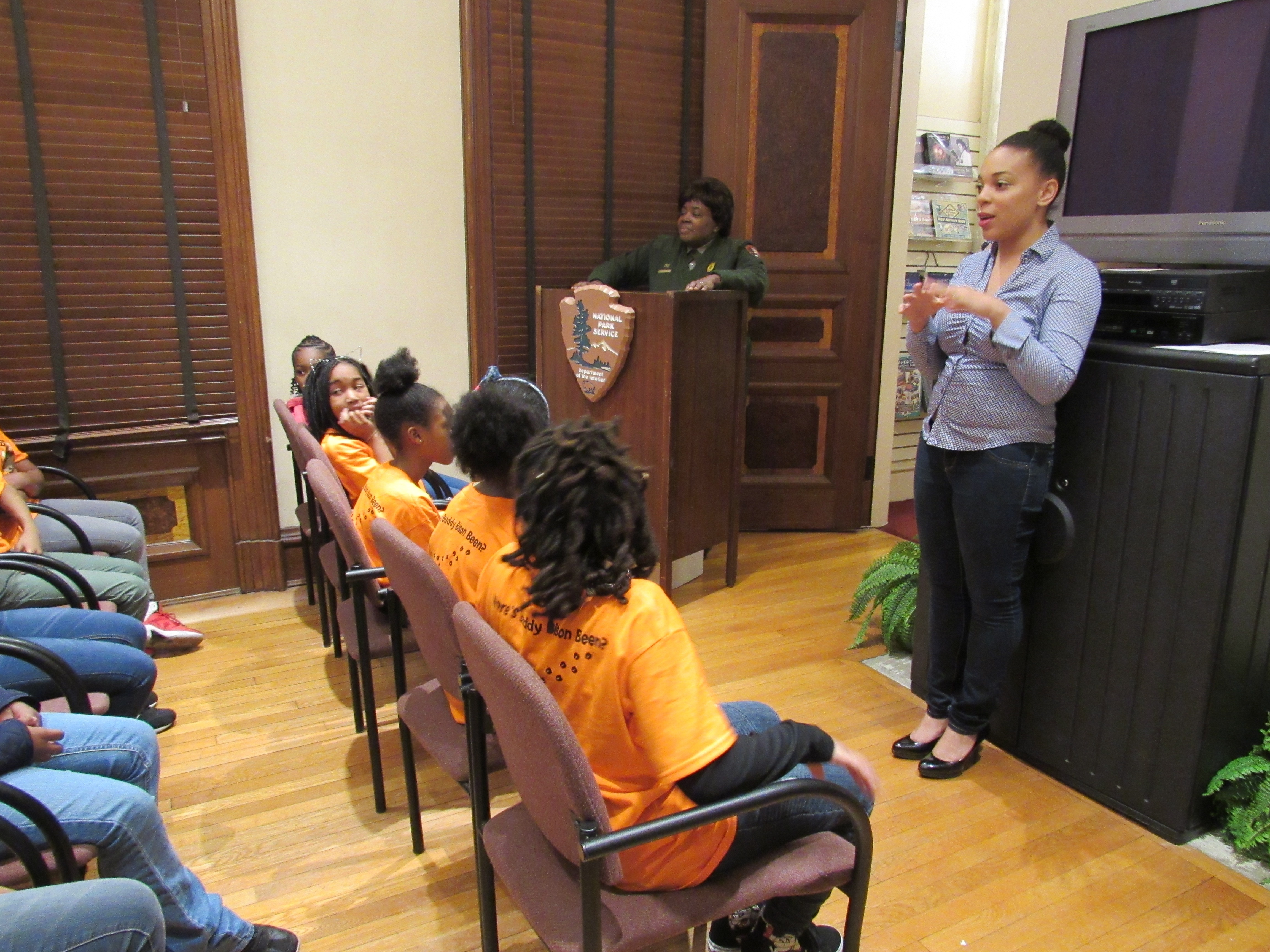 Donning bright orange “Buddy Bison” t-shirts, the girls filed into the historic home quietly taking in the majestic chandeliers and artifacts. Sierra Club staff member Kirin Kennedy kicked off the excitement for environmentalism by explaining how people like artists, writers, and lawyers can all be advocates for environmental stewardship. Ranger Margaret Mills led the students through an enthusiastic lesson on social justice and the story of Mary McLeod Bethune, starting a school with just five students and $1.50. Her legacy lived on through four presidents.