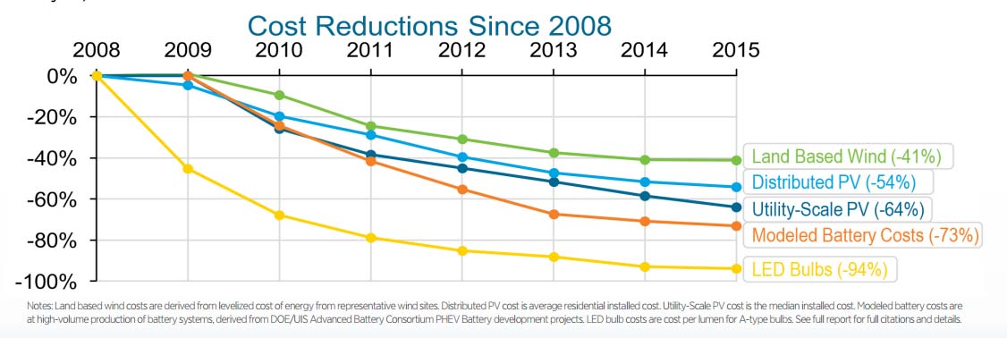 According to a new report by the Department of Energy, the cost of wind power is down 41 percent from 2008 and solar costs are down between 54 percent and 64 percent in that same period. Battery storage technology has also fallen 73 percent since 2008. As a result, clean energy is on the rise in states, cities, and communities across the country.