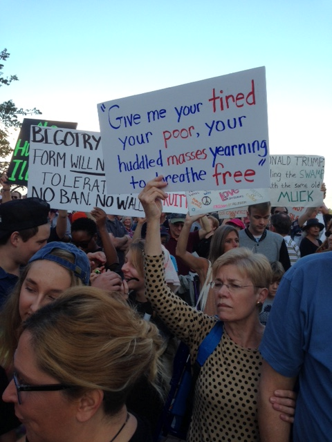 The immediate issue being raised by the protest was Trump’s executive order barring immigrants from seven predominately Muslim countries: Iran, Iraq, Somalia, Sudan, Libya and Yemen for 90 days. However, rally participants’ signs addressed issues such as climate denial, refugee entry, and resistance of the hate that has driven most of Trump’s policy-setting and decision-making in thenweeks since his inauguration.