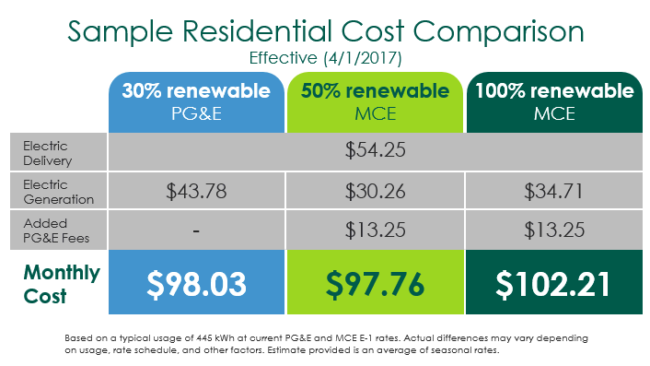 Marin Clean Energy (MCE) just reduced its rates for a second year in a row. Effective April 1, MCE’s energy rates went down by an average of 3.7%, bringing the cost of their Light Green 50% renewable energy service slightly lower than PG&E’s 30% renewable energy service. That’s cleaner, cheaper power!
