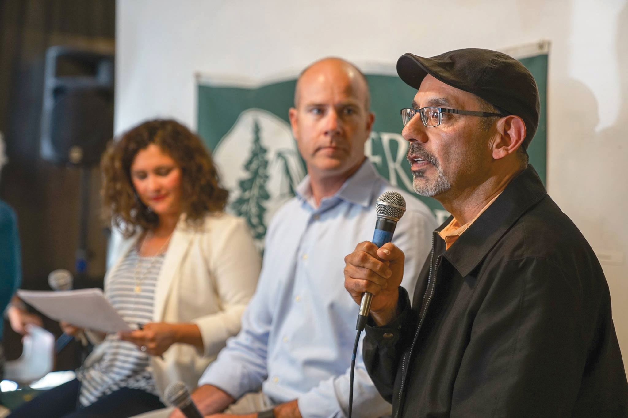 Photos by Natalie Gee: Top – Anthony Khalil of Literacy for Environmental Justice asks a question about activating youth in the environmental movement; Bottom – Antonio Díaz of PODER and California Environmental Justice Alliance (speaking), Michael Brune (center), and moderator Marisa Lagos of KQED.