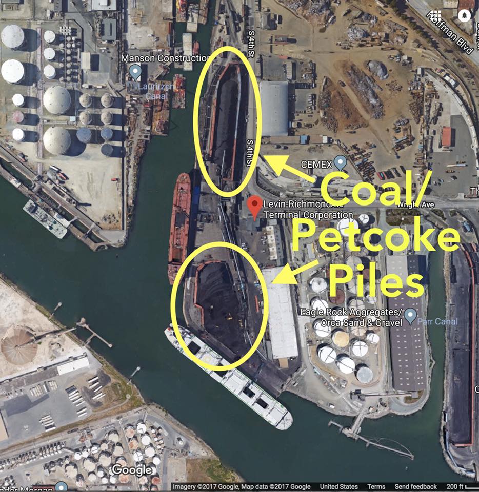 Image: Aerial view, via Google Maps, of the open-top coal/petcoke piles at the Levin-Richmond terminal.