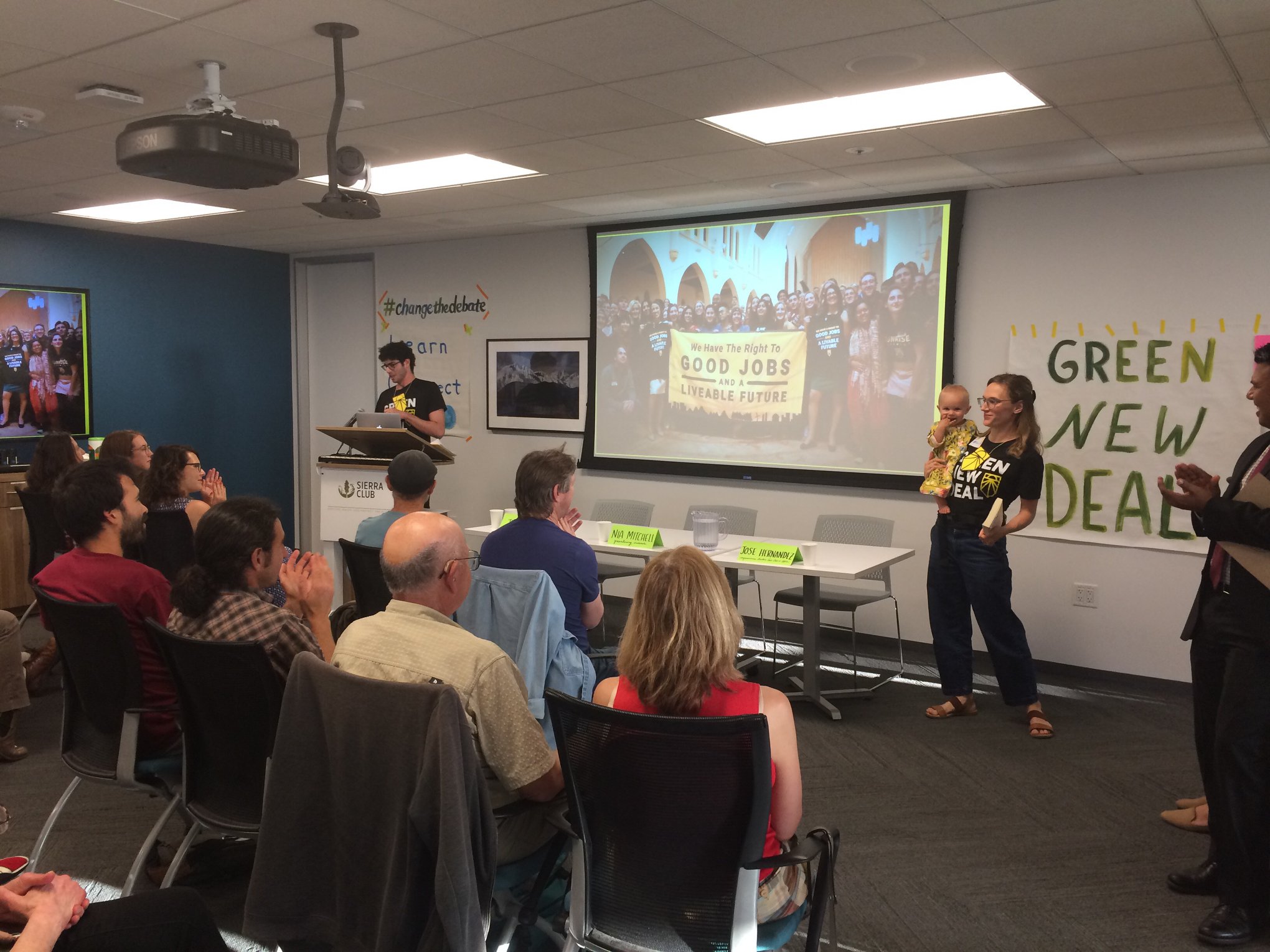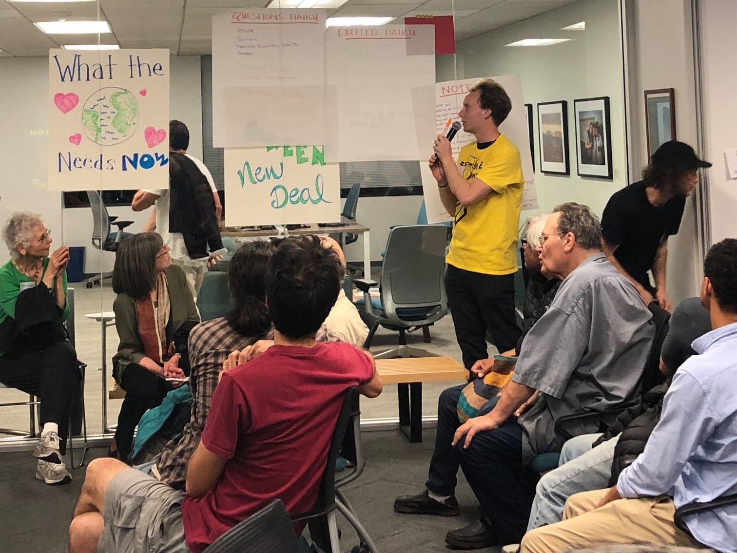 Over the past couple of months, members of Sunrise have organized 10 town halls in the Bay Area to bring the conversation about the Green New Deal to our communities. The Oakland Town Hall was held on April 24th at Sierra Club’s national headquarters, and organized by Sunrise members Willa, an artist, educator, and mother living in Oakland, and Kobi, a beekeeper and account manager designing solar systems at CivicSolar in uptown Oakland. We asked them a couple of questions to debrief on the town halls.