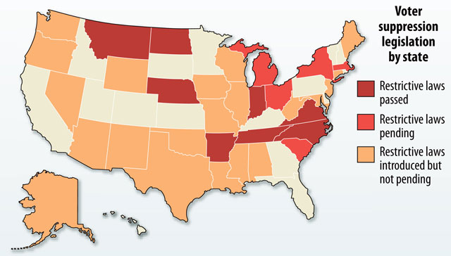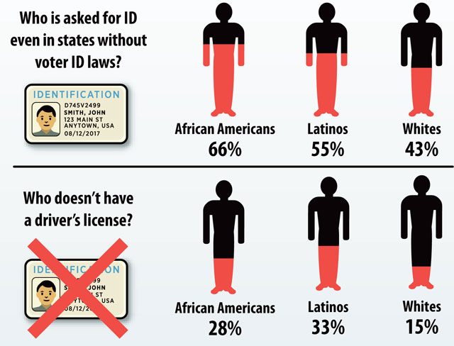 According to polls by the Pew Research Center, young people and people of color are among the strongest supporters of clean energy, which is one of the reasons why polluters are happy if they stay away from the polls. More and more states are making it harder for minorities and youth to vote, largely through "voter ID" laws requiring forms of identification that are often difficult and expensive to obtain. The figures shown here pertain to potential voters ages 18 to 29.
